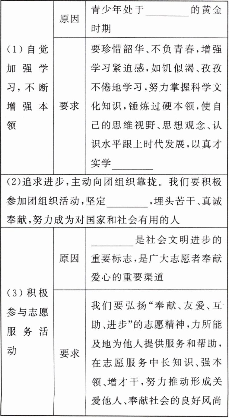 |(1)自觉加强学习,不断增强本领|原因|青少年处于______的黄金时期|
