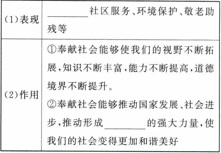 |(2)作用|①奉献社会能够使我们的视野不断拓展,知识不断丰富,能力不断提高,道德境界不断提升。②奉献社会能够推动国家发展、社会进步,推动形成______的强大力量,使我们的社会变得更加和谐美好|