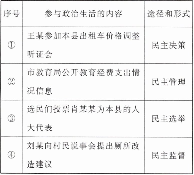 |序号|参与政治生活的内容|途径和形式|
