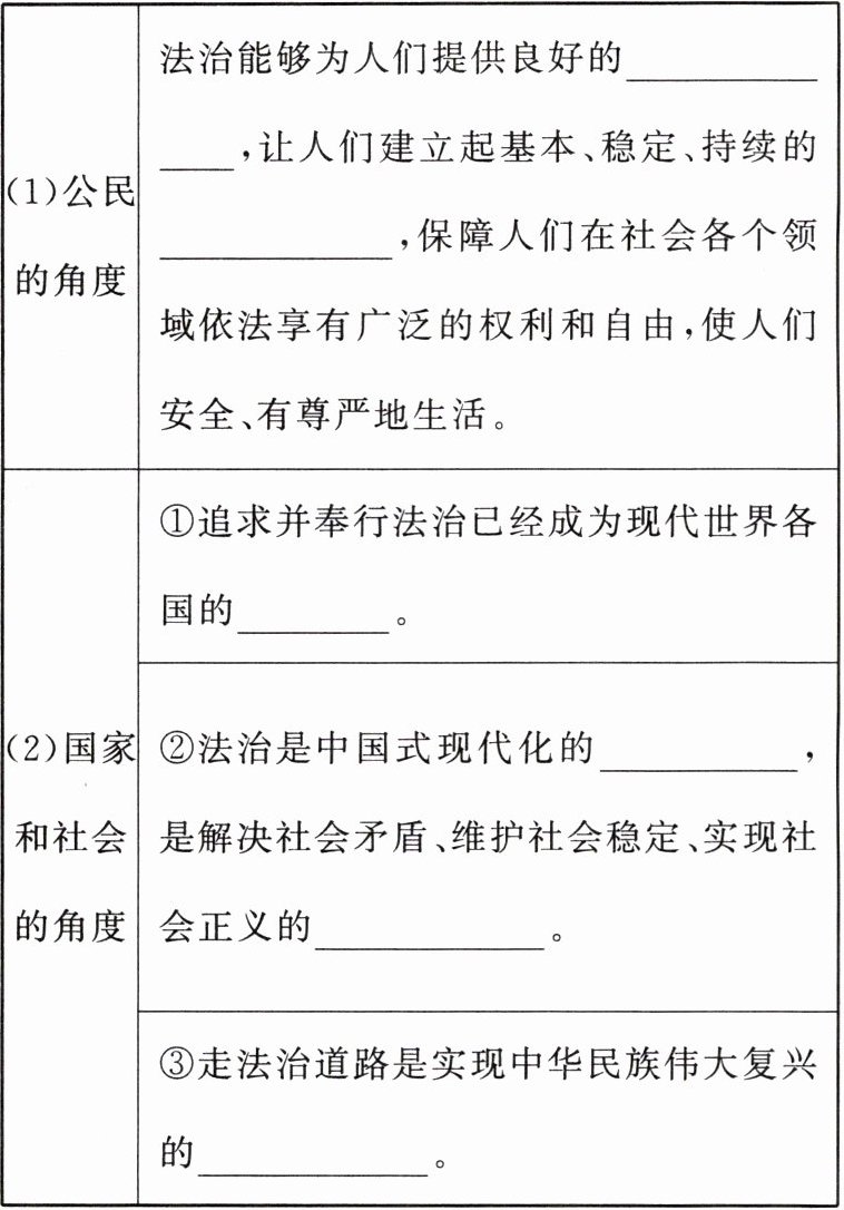 |(1)公民的角度|法治能够为人们提供良好的____,让人们建立起基本、稳定、持续的____,保障人们在社会各个领域依法享有广泛的权利和自由,使人们安全、有尊严地生活。|