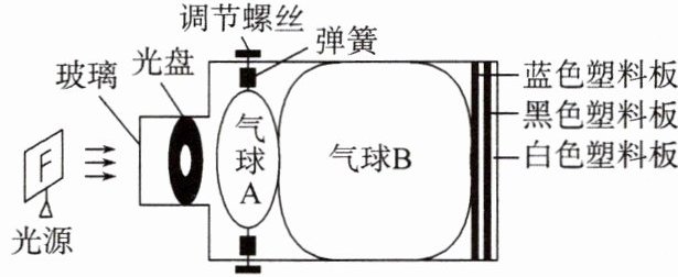 该兴趣小组的同学通过调节螺丝,使光源清晰地成像在蓝色塑料板上。为演示近视的形成,可以调节螺丝使气球A发生怎样的变化,从而让物体成像于蓝色塑料板前方?