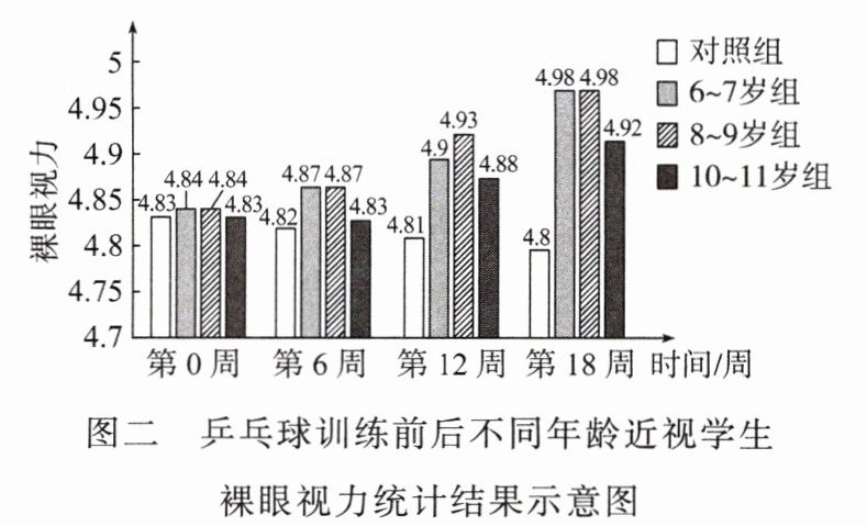 ① 据图二可得出结论:第一,经18周的乒乓球训练能提高6~7岁、8~9岁、10~11岁实验组近视儿童双眼视力水平;第二,