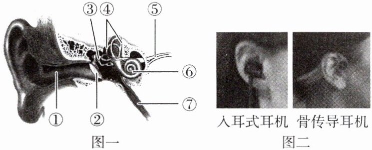 研究人员根据人耳(结构如图一)利用空气传导和骨传导听到声音的两种方式,制造出“入耳式耳机”和“骨传导耳机”(如图二),请据图回答下列问题。