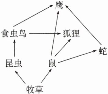 (2)图中有 5 条食物链,它们是相互关联的。其中最长的一条食物链是牧草→昆虫→食虫鸟→鹰或牧草→昆虫→食虫鸟→狐狸或牧草→鼠→蛇→鹰。