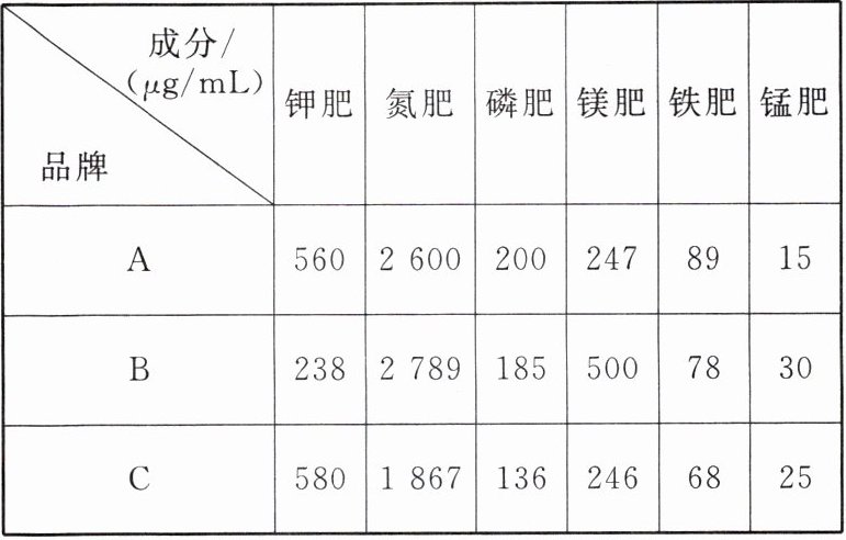 |成分/($\mu g/mL$)|钾肥|氮肥|磷肥|镁肥|铁肥|锰肥|