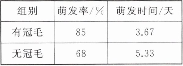 C 解析:有冠毛和无冠毛两组所用种子数量相等,目的是控制单一变量。该实验"研究冠毛对果实内种子的萌发是否有影响",实验中有无冠毛为实验变量,有冠毛组是对照组。从表格中可以看出无冠毛的蒲公英种子萌发率较低,萌发时间更长。由实验数据可知:无冠毛的蒲公英种子萌发率较低,萌发时间更长,有冠毛的蒲公英种子萌发率较高,萌发时间较短,因此去除冠毛会抑制蒲公英种子萌发。