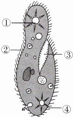 A 解析:[①]伸缩泡能排出多余的水分和代谢废物。草履虫用[②]纤毛在水中旋转运动。草履虫用[③]口沟从外界摄取食物,氧气的摄入和二氧化碳的排出都通过[④]表膜完成。不能消化的食物残渣从胞肛排出。