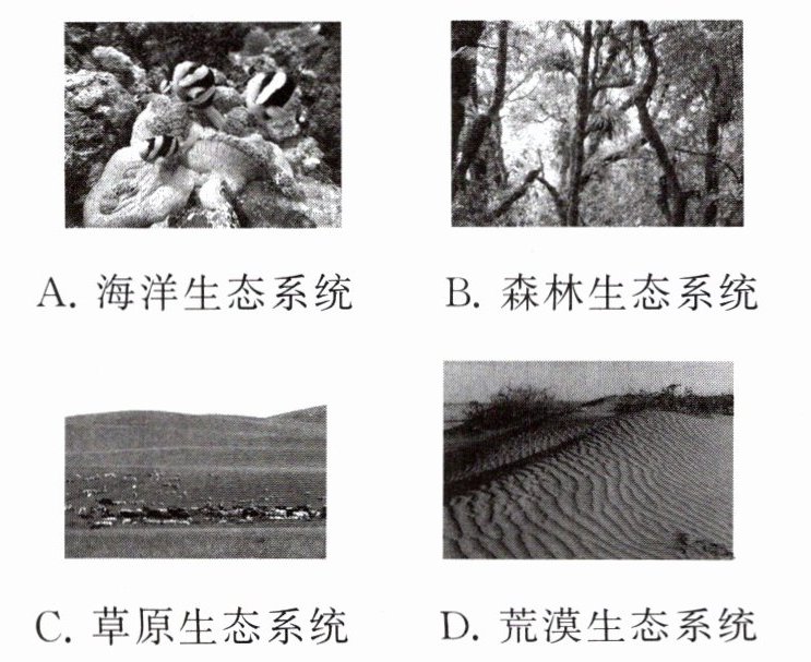 A 解析:生物圈是地球上最大的生态系统,它包括陆地、湿地和海洋生态系统。陆地生态系统又可细分为荒漠、草原、森林等生态系统。