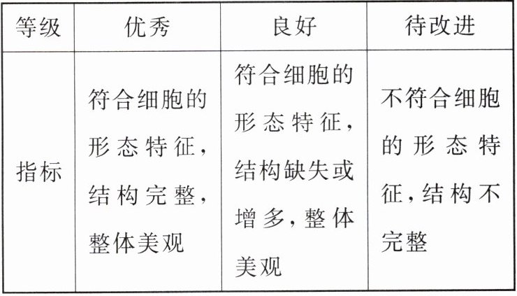 |指标|符合细胞的形态特征,结构完整,整体美观|符合细胞的形态特征,结构缺失或增多,整体美观|不符合细胞的形态特征,结构不完整|