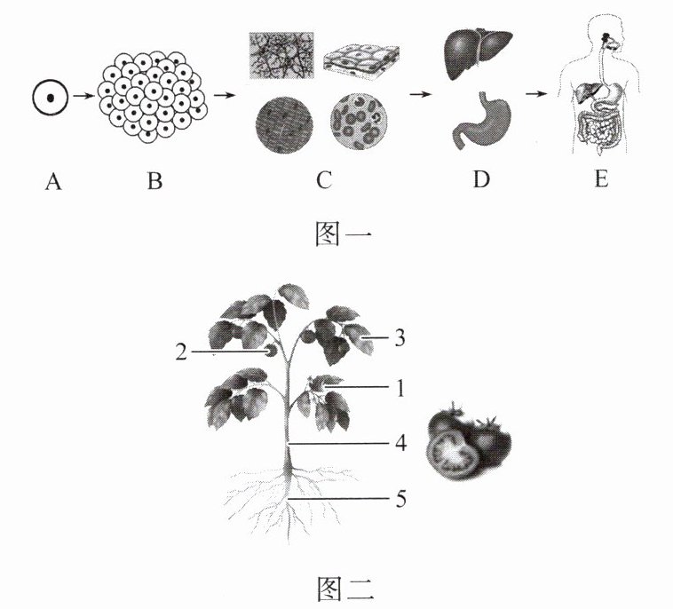 9. (2025·三亚期末)“家是最小国,国是千万家。”多细胞生物体如同国家一样,由最小单位按一定次序组织在一起。图一表示的是人体的不同结构层次,图二是番茄的植物体上的各器官,请回答下列问题。