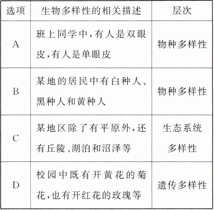 C 解析:双眼皮和单眼皮是同一物种的不同性状,属于遗传多样性。白种人、黑种人和黄种人属于同一物种,体现的是遗传多样性。某地区有平原、丘陵、湖泊和沼泽等,构成生态系统多样性。开黄花的菊花和开红花的玫瑰属于不同物种,属于物种多样性。