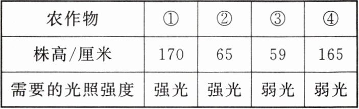 B 解析:分析表中数据可知,作物①④的株高较高,②③的株高较低,作物①②需要的光照强度为强光,适宜在较强光照下生长,③④需要的光照强度为弱光,适宜在弱光下生长。综合上述特点,应选取作物①和③进行搭配,作物①可利用上层光照进行光合作用,作物③能利用下层的弱光进行光合作用,从而提高光能利用率。