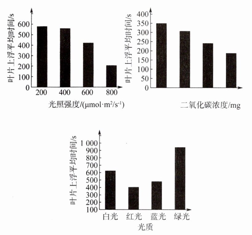 9. 研究人员利用某沉水植物的叶片分别探究了光照强度、二氧化碳浓度、光质对光合作用的影响,实验结果如图(一定范围内,叶片光合作用的强度越大,产生的氧气越多,沉在水中的叶片上浮时间越短)。下列相关叙述正确的是( )