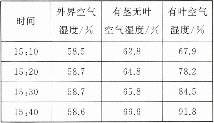 |时间|外界空气湿度/%|有茎无叶空气湿度/%|有叶空气湿度/%|