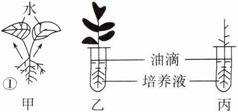 A 解析:物质[①]水主要由根尖成熟区细胞吸收。油滴可以在试管培养液表面形成油膜,作用是防止试管内的水蒸发。植物的蒸腾作用主要通过植物的叶进行,故乙中植物的蒸腾作用大于丙,则一段时间后乙液面低于丙液面。叶的上、下表面都有气孔,主要位于下表面。