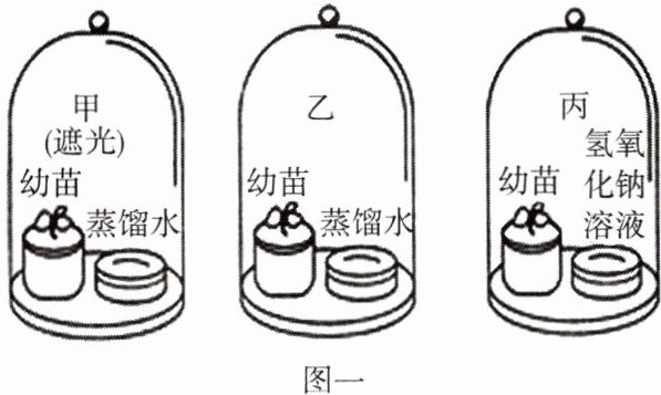 (2)甲组装置内是蒸馏水,丙组装置内是氢氧化钠溶液,且甲组装置与丙组装置的另一个区别是甲遮光,丙不遮光,有两个变量,变量不唯一,因此甲和丙不是一组对照实验。