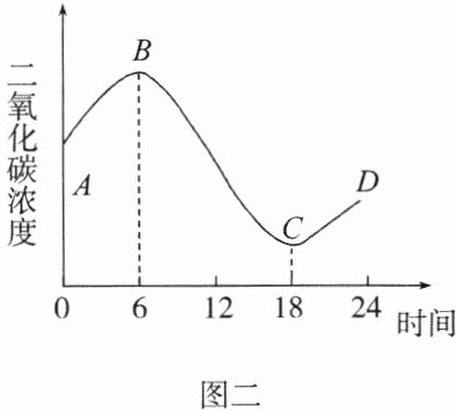 (4)如图二表示 0~24 时二氧化碳浓度的连续变化情况。甲、乙、丙三个装置中,二氧化碳浓度变化情况与图二中相符的是______。分析图中 0~6 时的曲线变化情况可知,该时间段植物主要进行______作用,图二中 B 点之后,幼苗体内的有机物开始积累,这是因为______。