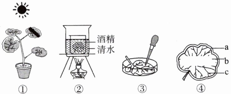 D 解析:①操作前要将银边天竺葵放在黑暗处2~3 d,目的是利用呼吸作用将叶内原有的淀粉运走耗尽。为防止叶的绿色对滴加碘液的显色反应有干扰,酒精能溶解叶绿素,②用酒精隔水加热脱色去除叶绿素,使叶由绿色变为黄白色。淀粉遇到碘液变蓝色,因此在步骤③中,滴加的试剂是碘液,其目的是检验植物光合作用制造的有机物是淀粉;④中a部分没有叶绿体,不能进行光合作用制造淀粉,因此滴加碘液不变蓝,b部分缺少光照,不能进行光合作用,滴加碘液不变蓝,c部分有叶绿体、光照,进行光合作用制造淀粉,因此滴加碘液变蓝。