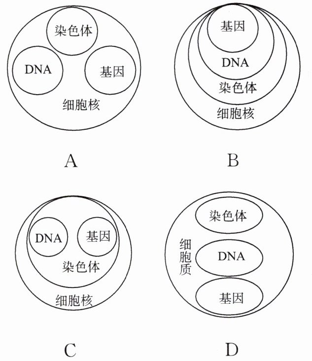 4. (2024·北京期末)概念图是一种直观形象的表达知识结构的方式,它能有效地呈现知识关联,有利于加深对知识的理解和快速记忆。如图表示基因、染色体和DNA之间的关系及在细胞结构中的位置,正确的是( )