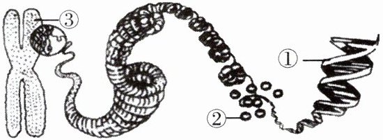 7. (2024·济宁模拟)学习了“基因是包含遗传信息的DNA片段”后,小路同学找来了一条纸带,在上面用不同图案标出了长短不一的区段,之后把纸带螺旋成短棒状。纸带、各标记区段、短棒分别代表的是( )