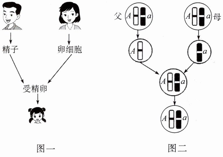 (3)图二中女儿的A基因(显性基因)来自____。假设A控制双眼皮,a控制单眼皮,则女儿是____。