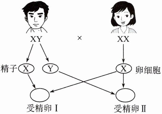 C 解析:男性精子的性染色体组成为X或Y;根据题图可知,受精卵Ⅰ的性染色体为XX,所以受精卵Ⅰ发育的胎儿性别是女孩;含X的精子和含Y的精子,两种精子与卵细胞结合是随机的,理论上生男生女的机会各占50%,是均等的;男性精子的类型决定了后代的性别类型。