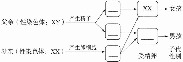 父亲(性染色体:$XY)\xrightarrow{产生精子}\begin{cases} □ \\ □ \end{cases}\begin{cases} □ \\ □ \xrightarrow{}\begin{cases} XX \xrightarrow{} $女孩$ \\ □ \xrightarrow{} $男孩$ \end{cases} $母亲(性染色体:$XX)\xrightarrow{产生卵细胞}□\xrightarrow{}$受精卵$\xrightarrow{}$子代性别