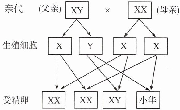 (1)由题图可知,小华是由含Y染色体的精子和卵细胞结合而来的,其体内的性染色体是XY,是男性,可见,生男生女取决于与卵细胞结合的精子的类型。