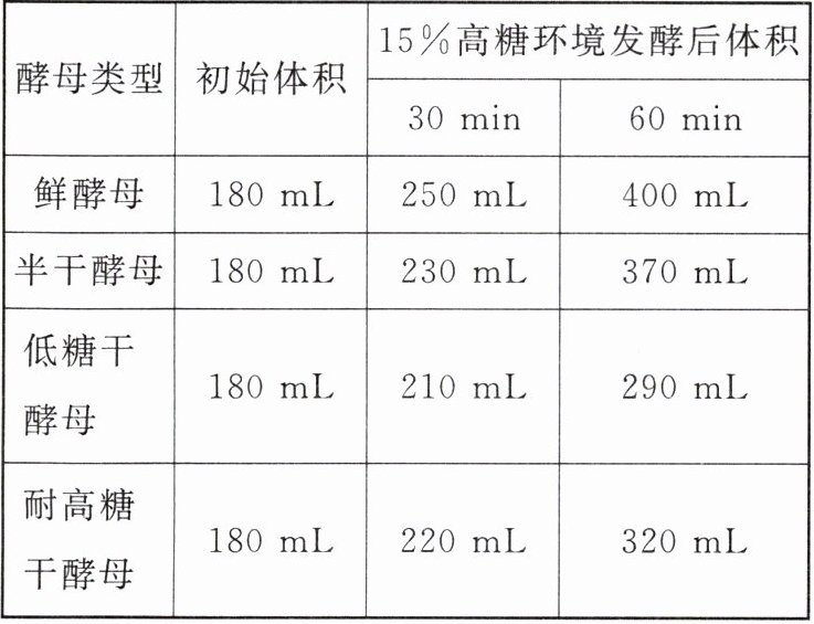 |酵母类型|初始体积|15%高糖环境发酵后体积|