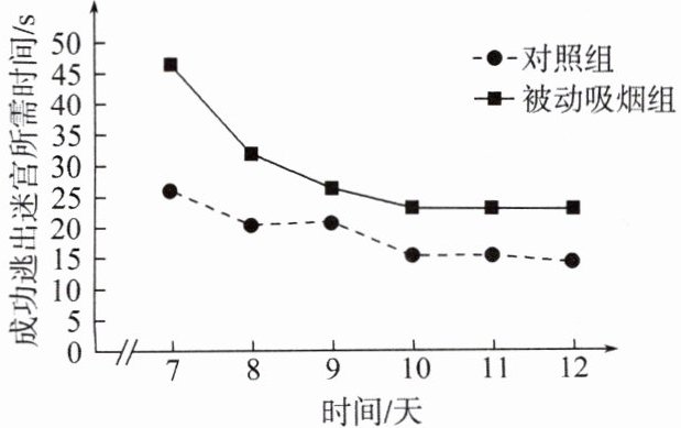 8. 为探究“被动吸烟对仔鼠学习记忆力的影响”,某研究团队训练仔鼠走迷宫,从第7天开始记录仔鼠逃出迷宫所需时间,结果如图。下列有关叙述中,错误的是( )