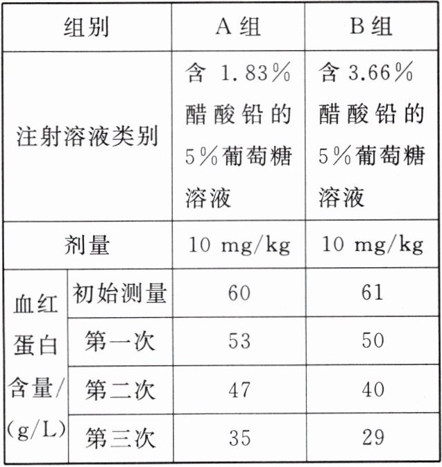 血铅含量对人体究竟有什么影响呢?有人做了这样一组实验,将质量为2.0~2.5kg的20只家兔分为两组。