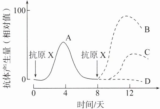 (5)如图所示,当注入抗原X后,抗体产生量的变化是曲线A。若第8天再次注射抗原X,图中表示抗体产生情况的曲线是____。