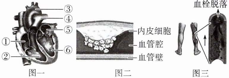 (1)要想了解血栓的知识就要先了解心脏的结构,心脏主要由____组织构成。心房和心室之间防止血液倒流的结构是____。图一所示的心脏四个腔中,流动的血液为静脉血的是____(填序号)。