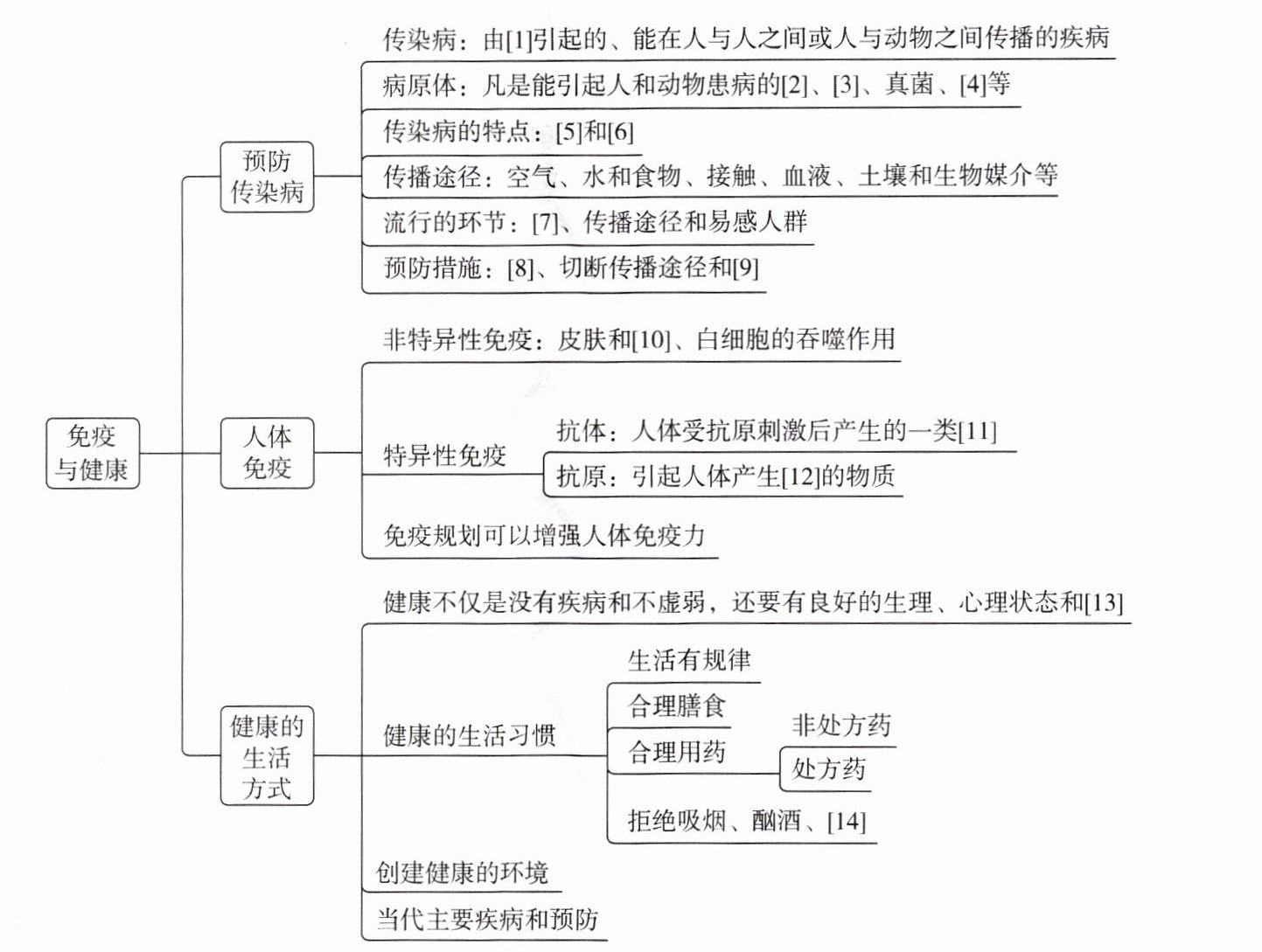 [1]病原体;[2]病毒;[3]细菌;[4]寄生虫;[5]传染性;[6]流行性;[7]传染源;[8]控制传染源;[9]保护易感人群;[10]黏膜;[11]蛋白质;[12]抗体;[13]社会适应能力;[14]吸毒
