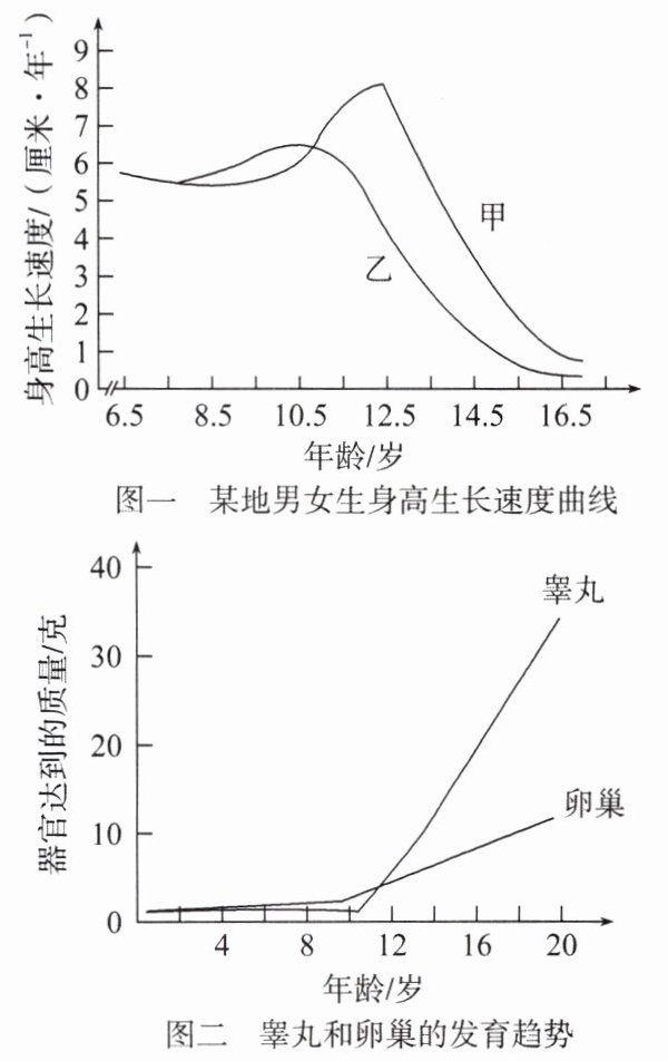 (1)进入青春期后,青少年的身高增长速度快,图一中,曲线甲表示______(填“男”或“女”)生身高增长速度变化曲线。