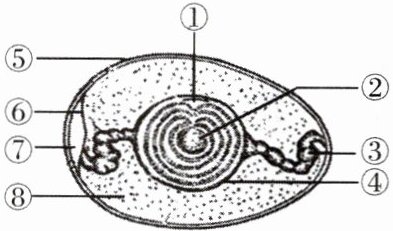 B 解析:题图中①是胚盘,②是卵黄,③是系带,④是卵黄膜,⑤是卵壳,⑥是内壳膜,⑦是气室,⑧是卵白。由题图可知,气室位于鸡卵的钝端,观察气室要在鸡卵的钝端敲出裂痕。