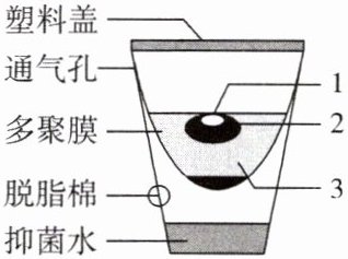 10. 中国首只无壳孵化小鸡——“小茶缸”诞生的大致过程:打开种蛋(即用于孵化的鸡卵),将内容物倒入如图的孵化装置中,盖上塑料盖,再放入孵化箱中孵化。图中 1、2、3 是去除卵壳和卵壳膜的鸡卵结构。下列分析错误的是 ( )