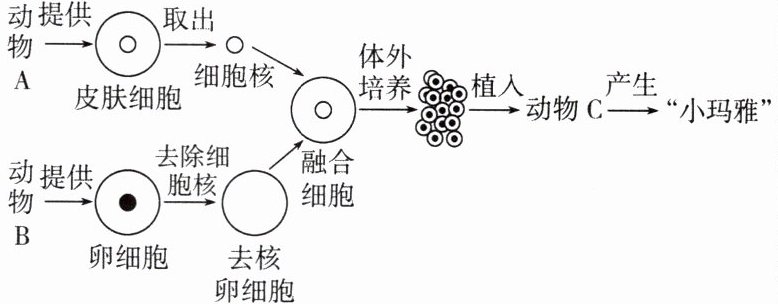C 解析:由图可知,动物A提供细胞核,动物B提供细胞质(去核卵细胞),动物C提供胚胎孕育场所,则“小玛雅”的遗传物质大部分来自动物A,故“小玛雅”和动物A几乎一模一样;克隆北极狼“小玛雅”的实例说明,细胞核控制着生物的发育和遗传,遗传信息主要存在于细胞核中。