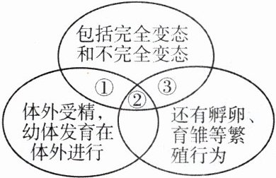 B 解析:从题图的描述可知,上方的椭圆表示昆虫生殖和发育的特征,左下方的椭圆是两栖动物生殖和发育的特征,右下方的椭圆是鸟类生殖和发育的特征。①昆虫与两栖动物的共同特征是变态发育;②昆虫、两栖动物、鸟类的共同特征是卵生;③鸟类与昆虫在生殖和发育上的共同特征是体内受精。