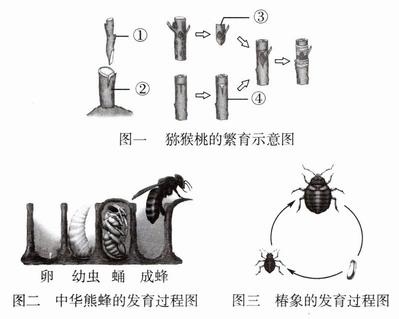 2. (2024·西安模拟)陕西是我国猕猴桃的主要产区。秦岭猕猴桃核心产业带提升了国产猕猴桃的市场竞争力。繁育猕猴桃主要有两种方式:一是选择个大的熟果,将果肉取出碾碎,筛选种子,埋在稍微湿润的土壤中,保障猕猴桃的发芽率;二是选择品质优良、芽眼饱满的粗壮枝条或发育良好的芽,用塑料带固定在生长健壮、无病虫害、根系发达的野生猕猴桃上(图一)。每年5~6月份是猕猴桃的开花时间,主要靠中华熊蜂进行传粉。猕猴桃常见的病虫害有蝽象、蝙蝠蛾等。
