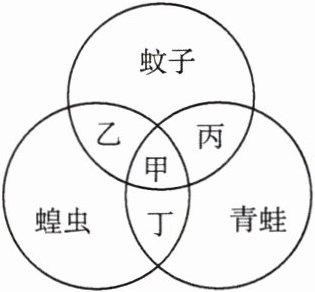 C 解析:甲表示蝗虫、蚊子、青蛙的共同特征,它们的生殖都有两性生殖细胞的结合,属于有性生殖,都是卵生、变态发育;乙表示蝗虫、蚊子的共同特征,它们都是节肢动物,都有外骨骼,外骨骼不能随身体的长大而长大,因此有蜕皮现象;丙表示蚊子、青蛙的共同特征,蚊子是体内受精,青蛙是体外受精。
