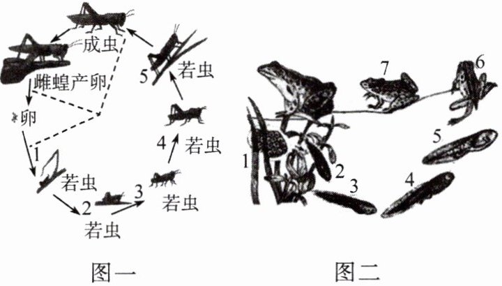 (1) 图一是蝗虫的发育过程,它的发育依次经过____三个时期,而且若虫与成虫的差别不明显,像这样的发育过程称为____发育。由于昆虫的外骨骼不能随虫体的长大而生长,所以昆虫生长发育过程中有____现象。