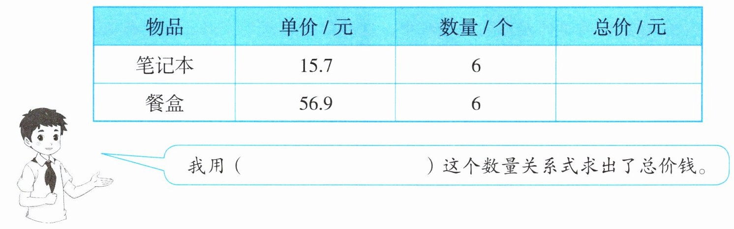 | 物品 | 单价 / 元 | 数量 / 个 | 总价 / 元 |