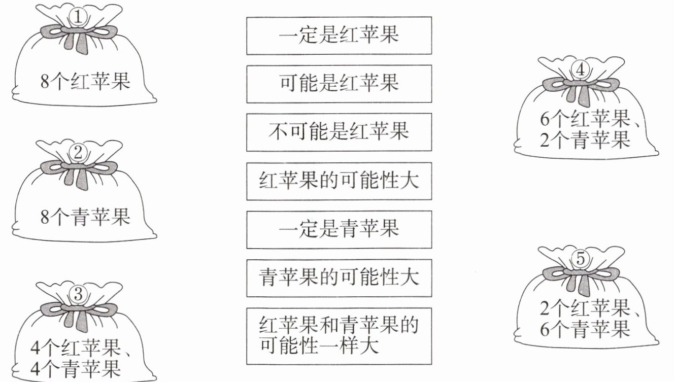 ①—一定是红苹果;②—一定是青苹果;③—红苹果和青苹果的可能性一样大;④—可能是红苹果、红苹果的可能性大;⑤—可能是红苹果、青苹果的可能性大