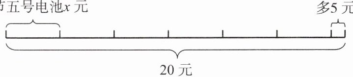 等量关系式:五号电池的单价×6+找回的钱=付的钱 方程:6x+5=20
