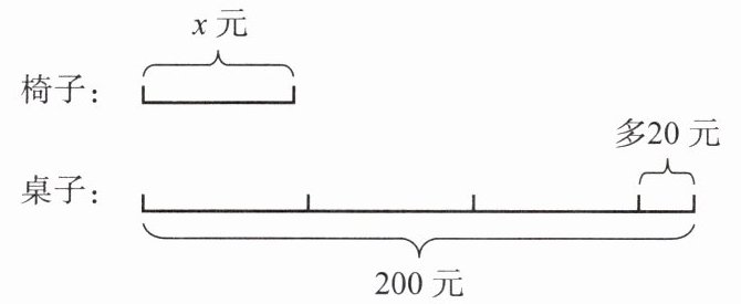 等量关系式:椅子的单价×3+20=桌子的单价 方程:3x+20=200