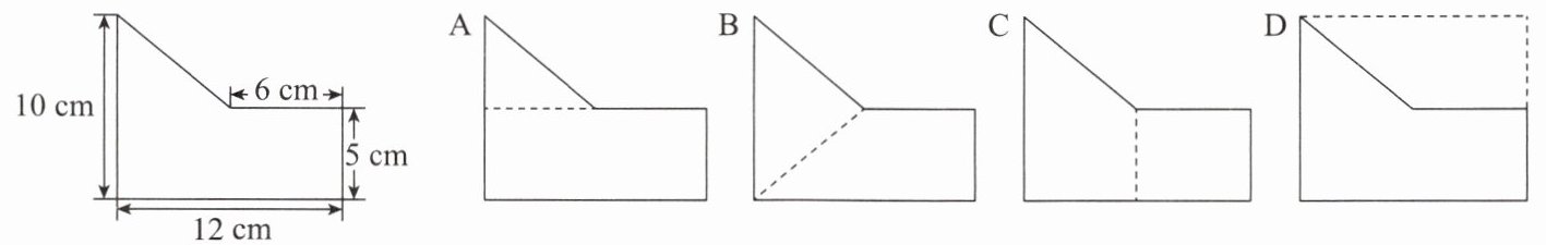 2. 要计算下图的面积,乐乐是这样计算的:$(12 - 6)×(10 - 5)÷2 + 12×5$,下图( )表示了乐乐的思考过程。