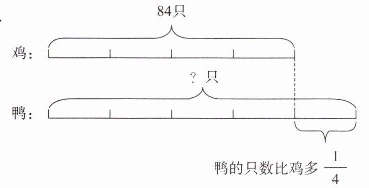 1. 鸡的只数$× \left(1+\dfrac{1}{4}\right)=$鸭的只数 $84× \left(1+\dfrac{1}{4}\right)=105$(只)