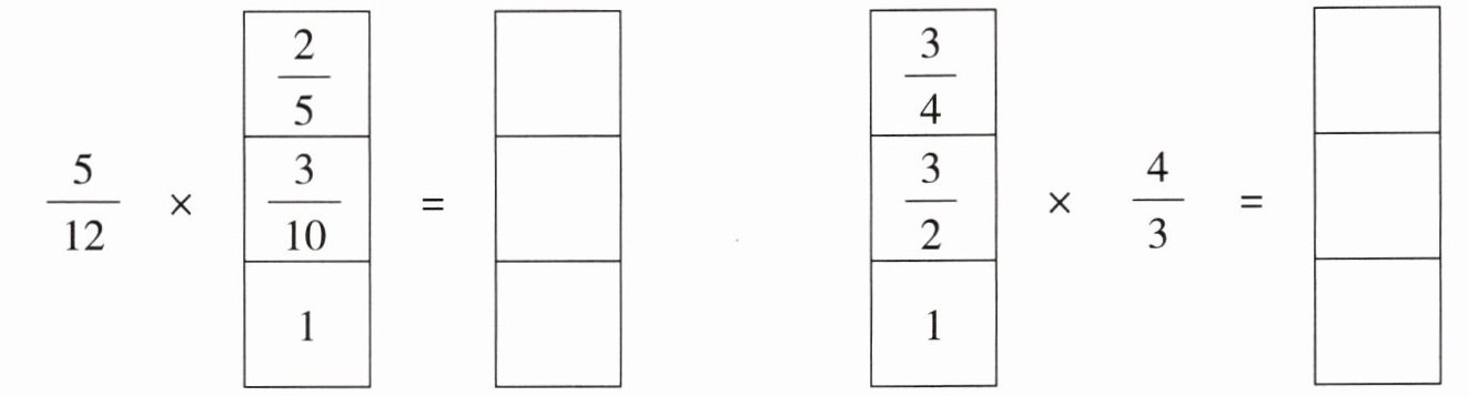 $\begin{array}{c|c}\dfrac{5}{12}×\dfrac{2}{5} & \dfrac{3}{4}×\dfrac{4}{3} \\\dfrac{3}{10} & \dfrac{3}{2} \\1 & 1\end{array} $