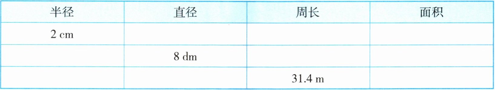 第一行:4 cm 12.56 cm 12.56 cm²;第二行:4 dm 25.12 dm 50.24 dm²;第三行:5 m 10 m 78.5 m²